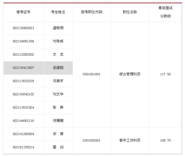 因部分考生放弃面试资格,按照公务员考试录用工作有关规定,经中央组织部审核,从公共科目笔试合格考生中,按笔试分数排序依次递补以下面试人员。请递补考生按照《共青团中央关于2013年招录机关工作人员邮寄材料的通知》有关要求提供材料并参加面试。
