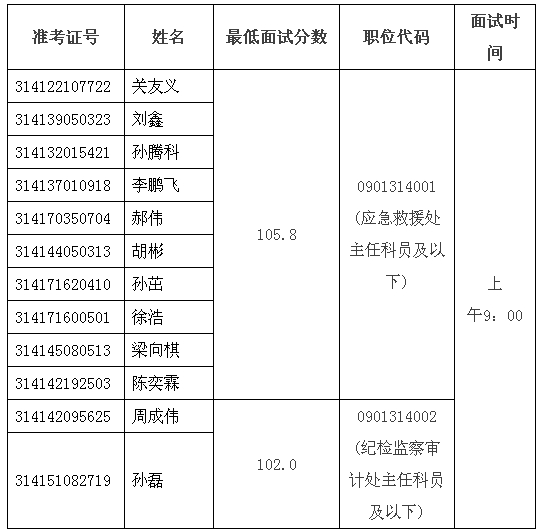 注:1.进入应急救援处主任科员及以下招录岗位面试名单考生刘伟、进入面试递补考生程鹏自愿面试资格,我局按笔试综合成绩排名高低递补陈奕霖进入面试。