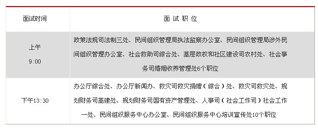 面试按不同职位分上、下午进行,请考生按各职位要求分别于相应时间报到并参加面试。具体安排如下: