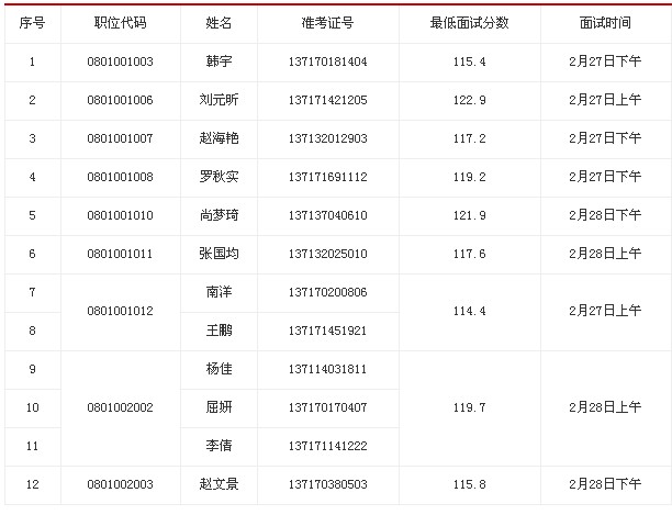 因部分进入我局面试范围的考生自愿放弃面试资格,根据有关规定,按照公共科目笔试成绩顺序,递补以下考生为面试人选: