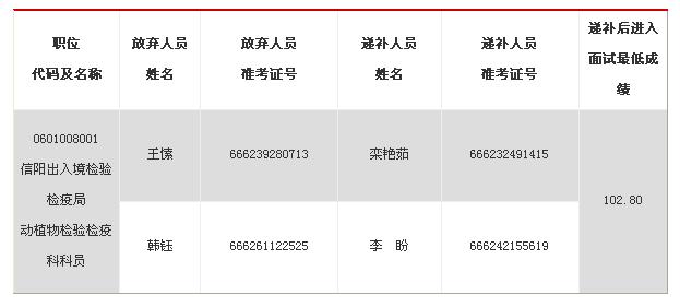 2013年公务员面试递补公告:河南出入境检验检疫局