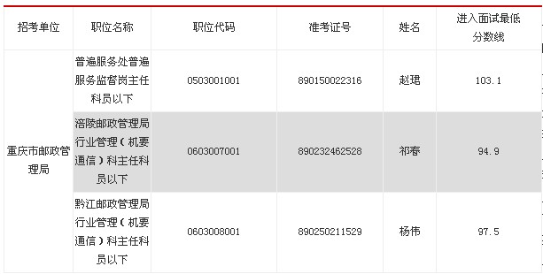 由于部分考生个人自愿放弃面试资格,根据中央机关及其直属机构考试录用公务员的有关规定,按公共科目笔试成绩由高到低的顺序,确定以下3人递补参加重庆市邮政管理局2013年公务员录用面试。