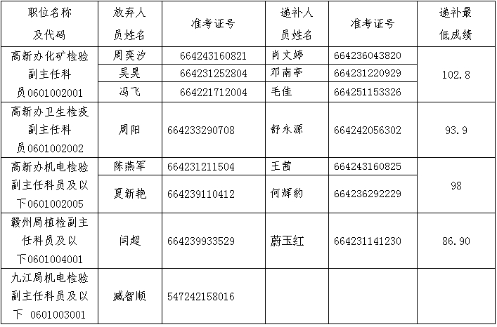 2、九江局机电检验副主任科员及以下职位(0601003001)无符合递补条件人员,未作递补。