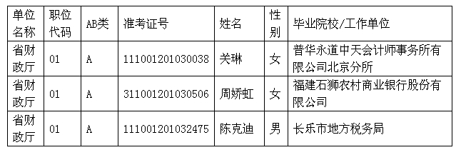 根据《公务员录用规定(试行)》和《福建省2012年度秋季考试录用公务员工作实施方案》的要求,在笔试、面试、体检和考察合格的基础上,拟录用考生关琳等3人为福建省财政厅公务员。现向社会予以公示。公示期间,如有问题,请及时向福建省公务员局考试录用处反映。