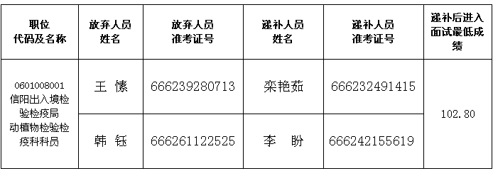 因部分进入面试名单人员自愿放弃面试资格,根据公务员考录有关规定,拟进行递补(详见下表)。