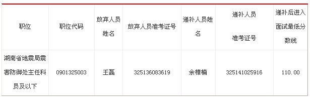 因部分考生自愿放弃面试资格,根据公务员考录有关规定,按照公共科目笔试成绩从高到低的顺序递补1个职位的1名考生进入面试名单,现公告如下: