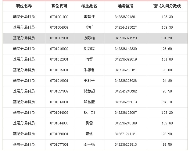 因部分考生放弃面试资格,根据公务员招考有关规定,拟在公共科目笔试合格的考生中,按照笔试成绩从高到低的顺序,递补以下考生为面试人选: