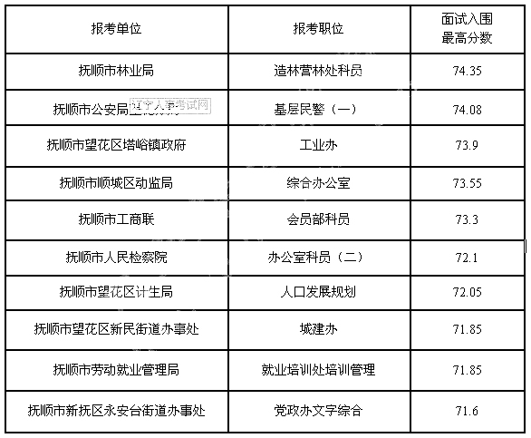 对抚顺市2012年的面试入围分数情况进行分析统计,总结出抚顺市十大竞争最激烈岗位,因公安系统需加考《公安基础知识》,故以最后加权分数统计入围分数,非公安系统的原始分是入围分数*2,最高分都没有超过75分,相对其他地市分数较低,竞争压力也稍弱些。