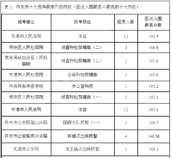 对丹东市2012年的面试入围分数情况进行分析统计,总结出丹东市十大竞争最激烈岗位,最高分都没有超过150分,相对其他地市分数较低。
