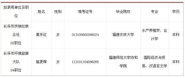 长乐市政府系统2012年秋拟录用人员名单公示