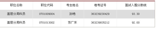 因部分考生放弃面试资格,根据公务员招考有关规定,拟在公共科目笔试合格的考生中,按照笔试成绩从高到低的顺序,递补以下考生为面试人选: