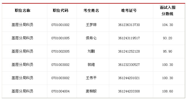 因个别考生放弃面试资格,以及个别考生资格复审不合格,根据公务员招考有关规定,拟在公共科目笔试合格的考生中,按照笔试成绩从高到低的顺序,递补以下考生为面试人选: