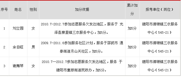 2013年建阳市事业单位招聘笔试成绩加分情况公示