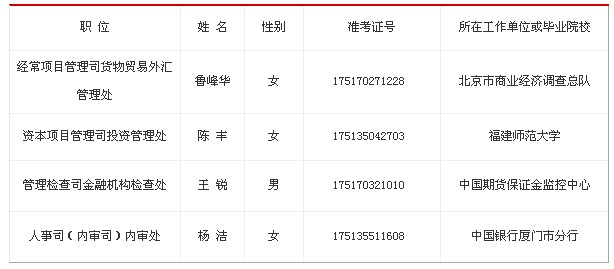 根据《中央机关及其直属机构2013年度考试录用公务员工作实施方案》,按照公开、平等、竞争、择优的原则,经公共科目笔试、面试、体检和考察,确定鲁峰华等4人为国家外汇管理局2013年度拟录用公务员。现予公示。