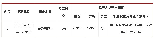 根据《厦门市市属医疗卫生事业单位二?一二年春季补充卫生专业工作人员统一考试简章》的要求,经笔试、面试、体检和考核程序,拟聘用林艺兰等壹名考生为我市市属医疗卫生机构工作人员。现将拟聘用人员名单予以公示。