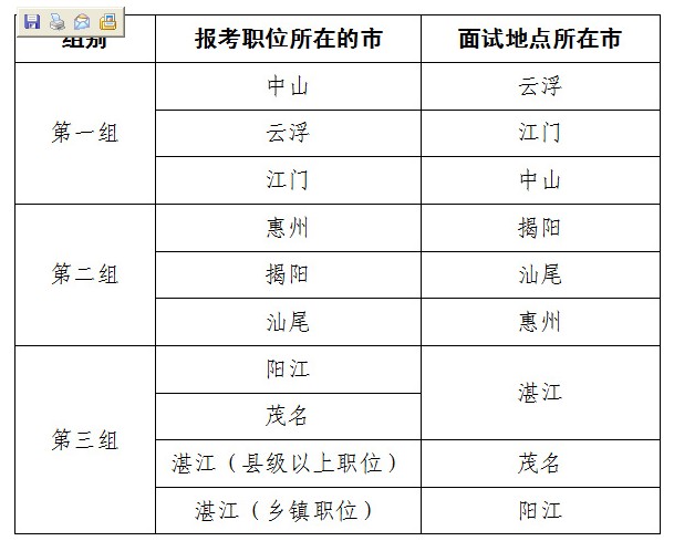 即:报考中山市职位的考生到云浮市面试,云浮市职位的考生到江门市面试,江门市职位的考生到中山市面试;