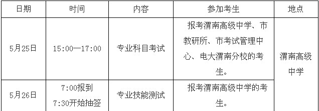 请参加专业技能测试的考生5月26日早7:00前到渭南高级中学明德楼4楼候考室报到,迟到30分钟考生取消技能测试资格。