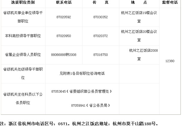 2013年浙江省直单位竞争性选拔干部各部门联系方式如下: