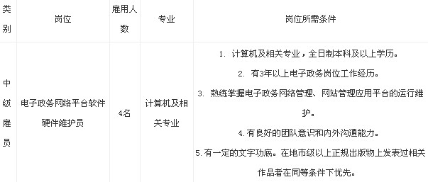 根据工作需要,经长沙市人民政府批准,长沙市人民政府办公厅下属长沙市人民政府电子政务管理办公室面向社会公开招聘4名政府雇员。现将有关事项公布如下。
