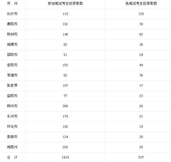 我省选聘高校毕业生到村任职报名和笔试工作已完成,根据《湖南省2013年选聘高校毕业生到村任职公告》,笔试免考生全部参加面试,按报名人数适当比例确定免笔试考生选聘名额。参加笔试考生选聘名额,为各市州选聘计划总数减去免笔试考生选聘数。2013全省选聘名额计划为2456名,共有12433名参加笔试考生和2120名免笔试考生。其中参加笔试考生招录计划1919名,免笔试考生招录计划537名,各市州选聘名额计划划分公告如下: