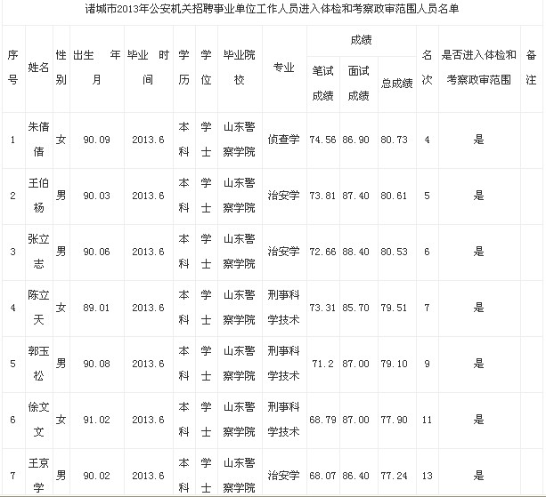 摘要 2013年诸城市公安机关招聘事业单位体检名单公示