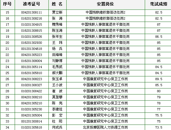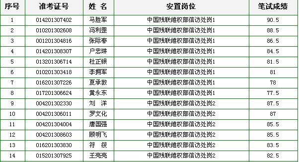 根据2013年中央单位接收安置军转干部统一笔试成绩,现将中国残联2013年接收安置军转干部面试人员名单和成绩公告如下: