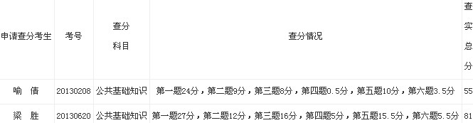 我局所属事业单位公开招考、考聘工作人员考试笔试成绩公布后,在查分时间内共有2位考生申请《公共基础知识》科目的查分,我局会同市纪委组成查分组按照《贵州省人事考试查卷(卡)暂行规定》进行核查,现将核查结果公告如下: