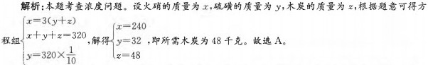 【例题4】配制黑火药用的原料是火硝、硫磺和木炭。火硝的质量是硫磺和木炭的3倍,硫磺只占原料总量的1/10,要配制这种黑火药320千克,需要木炭多少千克?()