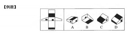 这类试题一般在备选项中给出四个图形,其中只有一个是由左边的纸板折叠而成的,要求应试者选 出正确的一个。