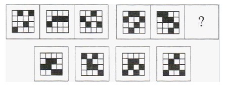 解析:选B。此题考查阴影的移动。题干部分有两组图形,第一组两块阴影部分围绕中心的白色部分顺时针移动,每次阴影都顺时针前进一格,所以第二组运用完全相同的规律,阴影部分每次顺时针前进一格,我们可以先拿前两个图验证这一规律,可行那么就继续顺时针一格,所以选择B。选项C、D中阴影部分发生了断裂,原图中本身是连接起来的阴影,所以排除CD。选项A与第二组第二个图一样,所以也排除,只能选择B。
