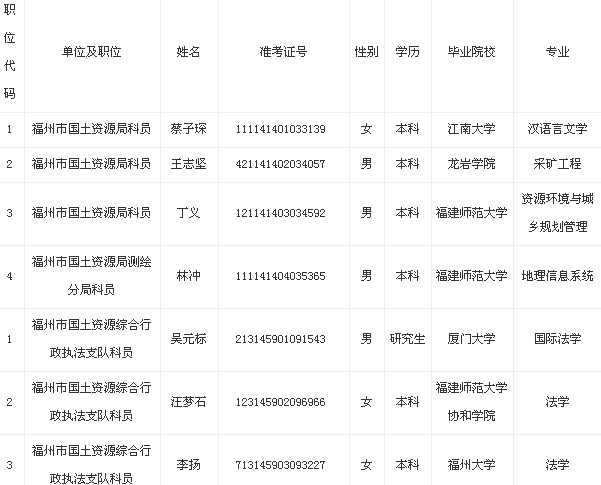 2013年福建福州市国土资源局拟录用公务员名单公示