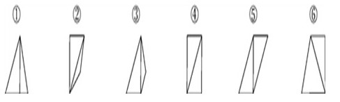 这是一组对分组分类考察的图形。图形中有的图形两个三角形都是直角三角形,有的图形只有一个三角形是直角三角形。根据图形中直角三角形的数量将图形进行分组分类。