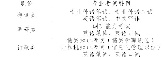 翻译类重点考察考生本专业外语的听、说、读、写、译等基本功;调研类重点考察考生的调研理论基本功、文字表达能力和英语水平;行政类重点考察考生的本专业知识和英语水平。全体考生均需参加心理素质测试(笔试,不计入考试成绩)。报考英语翻译职位的考生,参加专业外语笔试,不再进行英语笔试。