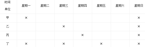 2.B、C、D四人分别要到甲、乙、丙、丁四个单位中的一个单位去办事。已知甲单位星期一不接待,乙单位星期三不接待,丙单位星期四不接待,丁单位只在星期二、四、六接待,星期日四个单位都不办公。一天,他们议论起哪天去办事。