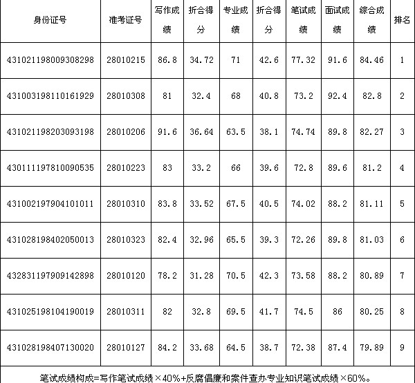 2013年湖南郴州市纪委监察局公务员综合成绩表如下: