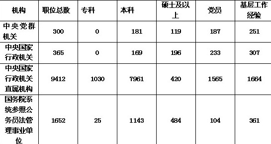 通过分析发现中央党群机关、中央国家行政机关、中央国家行政机关直属机构和国务院系统参照公务员法管理事业单位中都存在着对于学历、学位、政治面貌、基层工作经验等全部条件进行限制的职位,其中中央党群机关和国务院系统参照公务员法管理事业单位各有1个,中央国家行政机关有6个,而中央国家行政机关直属机构则有153个,且都为市(地)级及以下的职位。因此,在今年的报考中报考者一定要注意对于自己所报考职位的各项限制和要求。同时也应注意“其他条件”和“备注”这两栏里的要求。希望各位考生认真备考,仔细选定适合自身的职位,在11月份的国考中取得理想的成绩。