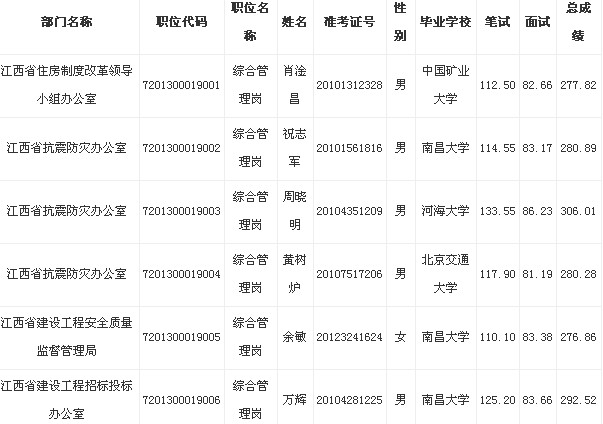 2013年江西省住建厅拟录用公务员公示