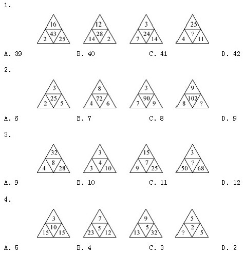 1.B【解析】原数列具有如下关系:2+16+25=43,12+14+2=28,3+7+14=24,4+25+11=(40)。