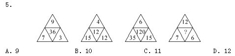 5.D【解析】原数列具有如下关系:(7-3)×9=36,(15-12)×4=12,(35-15)×6=120,(7-6)×12=(12)。