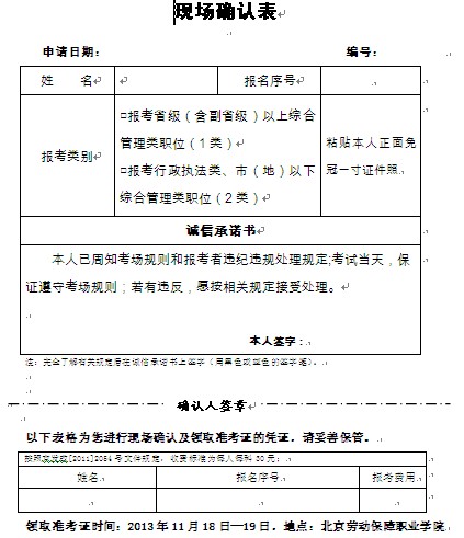 五、报名确认成功后,报考人员请于2013年11月18日10:00至11月23日12:00期间登录北京市人力资源和社会保障局网站(http://www.bjrbj.gov.cn/)下载打印准考证。持准考证、本人身份证原件,在准考证规定的时间、地点参加考试。缺少证件的考生不得参加考试。