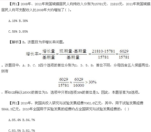 一般情况下,遇到A/B这种类型会出现在增长率、现期比重、现期倍数、现期平均数中。在用的时候,并不是把所有A和B中出现的数字全部用到,而只需要根据选项的差距来判断是四舍五入每个数取2位还是3位即可。若选项差距比较大,比如选项第一位相同,第二位不同,那么A、B各四舍五入各保留两位即可;若选项相对来说不是太大,但也有一定差距,比如在出现选项第一位相同,第二位不同时,此时,为了保证精确,A、B各四舍五入保留3位即可。