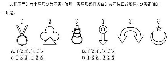 5.【答案】D。解析:给出的六个图形差异较大,排除数量性考点,考虑图形的构成特征。观察发现图形中均含有直线和曲线,进一步分析图形中直线与曲线的位置关系,①③⑥中直线位于曲线上方,②④⑤中直线位于曲线下方。