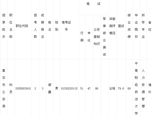 2013年湖北黄石市公务员拟录用名单(递补)公示