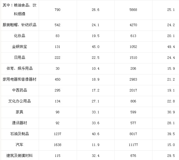 2010年,全省限额以上批发和零售业中,家具类零售额24.13亿元,增长53.0%;汽车类零售额423.17亿元,增长44.0%;金银珠宝类零售额24.49亿元,增长44.9%;家用电器和音像器材类零售额119.18亿元,增长39.4%。