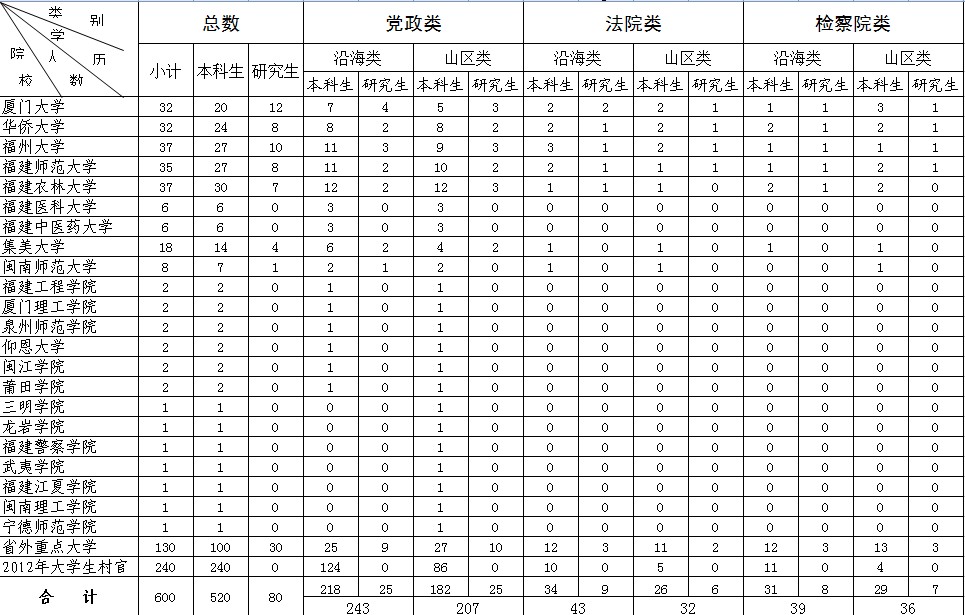 2014年计划选调大学本科生、硕士研究生600名,其中:从2014年应届优秀本科、硕士研究生毕业生选调360名,分别为党政类240名(含硕士研究生50名),法、检类120名(含硕士研究生30名);从2012年大学生村官选调240名(其中党政类210名,法、检类30名。根据 2012年大学生村官服务期满生源分布情况,给予23个省级扶贫开发工作重点县增加2至3名定向招录名额,录用后须与当地组织部门签订5年最低服务年限的协议)。对应届博士研究生的选调生,将侧重选拔环保、水利、海洋经济、财政金融、城市规划等专业,并根据省直机关和各设区市、平潭综合实验区的实际需求和编制使用情况确定。接收安排选调生所需的行政编制,由各地在省里下达的本级行政编制中解决。