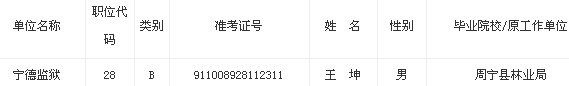 根据《公务员录用规定(试行)》和《福建省2013年度考试录用公务员工作实施方案》的要求,在笔试、面试、体检和考察合格的基础上,拟录用考生王坤同志为省监狱系统公务员,现向社会予以公示。公示期间,如有问题,请及时反映。