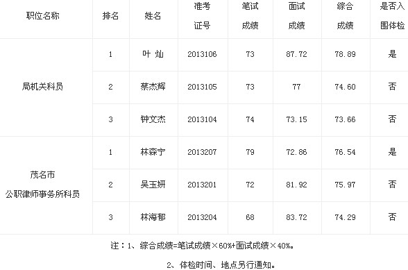 广东省茂名市司法局2013年公开遴选公务员考试综合成绩公布,具体如下: