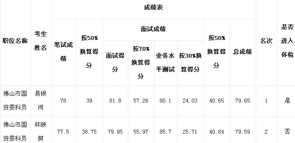 广东省佛山市国资委公开遴选公务员成绩公布,具体如下:
