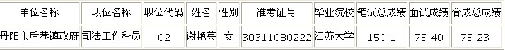 根据国公考录函〔2009〕07号文件,报考丹阳市后巷镇政府的谢艳英同志,因怀孕暂缓录用。现经过笔试、面试、体检和考察(政审)等规定程序,符合公务员录用条件,拟予录用。公示时间为2014年01月13日至01月19日。监督电话:0511-85340500。