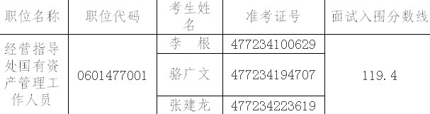 参加面试人数与录用计划数比例达到3:1,面试后按综合成绩从高到低的顺序确定体检人选;比例低于3:1的,面试后按综合成绩从高到低的顺序确定体检人选,考生面试成绩应达到我局规定的60分合格分数线,方可进入体检;我局将以电话方式通知考生本人,并组织前往指定医院进行体检,体检通过后方可进入考察程序。考察人选按照录用人数1:1的比例确定。体检和考察出现不合格需递补人选时将以综合成绩从高到低的顺序确定递补人选。